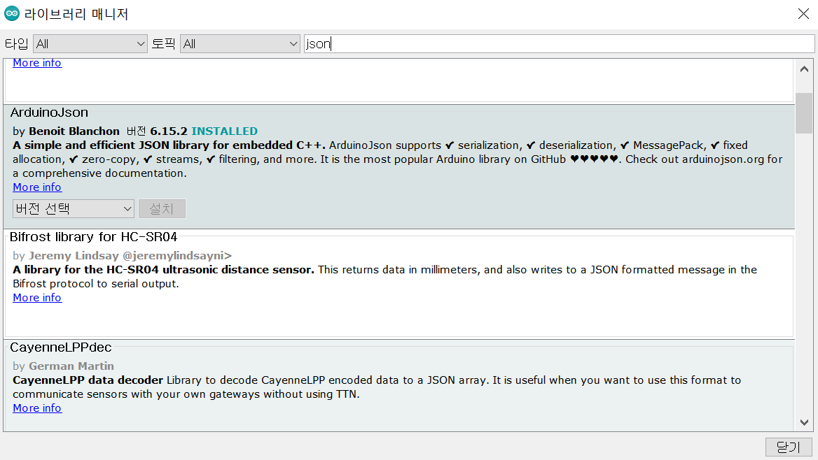 *다른거 말고 ArduinoJson by Benoit Blanchon 설치해야 함