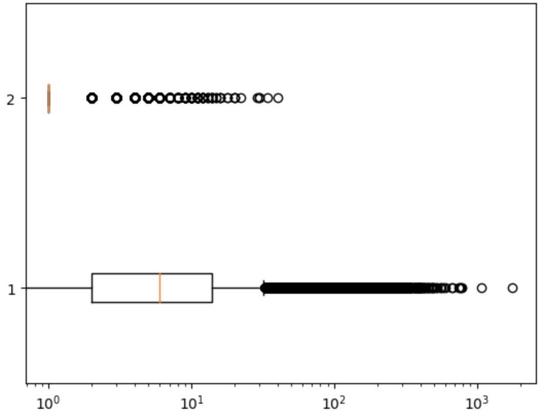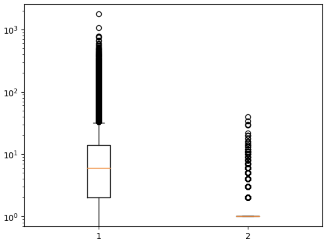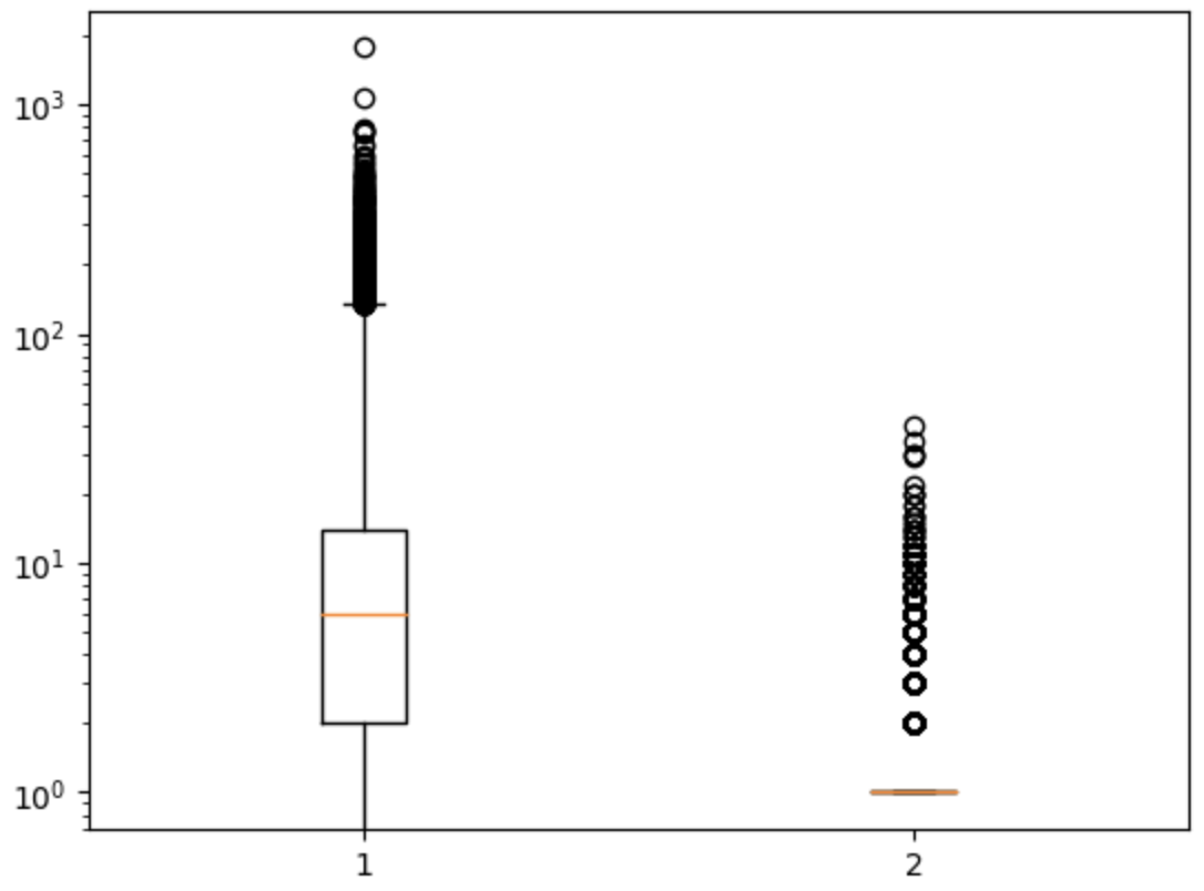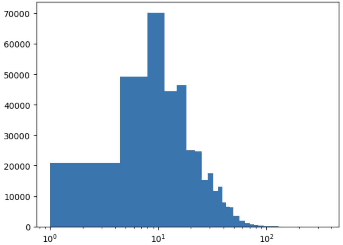 한 구간의 도수가 너무 커서 다른 구간에는 도수가 표시되지 않는 현상 발생 → y축을 로그 스케일로 바꾸어 해결