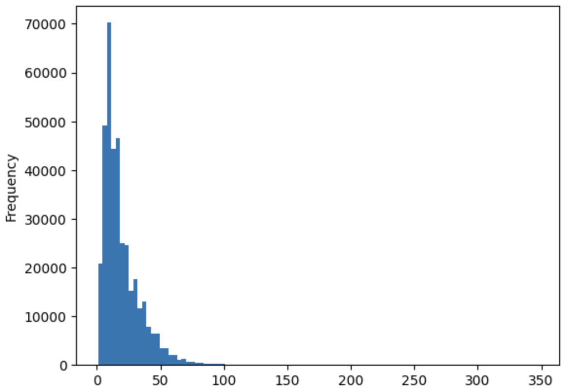 : hist() 함수는 기본 10개 구간 사용 → bins 매개변수에서 이를 100으로 바꾸면 데이터 분포를 더 세밀하게 관찰 가능