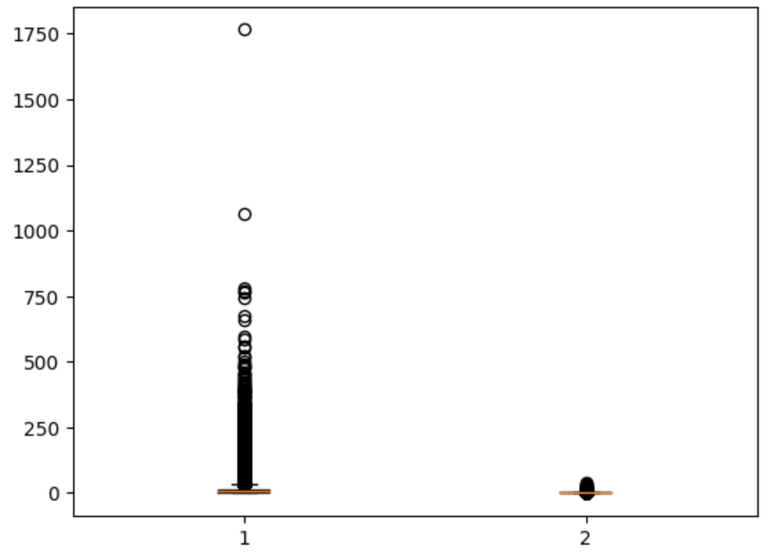 plt.boxplot(ns_book7[['대출건수','도서권수']], whis=10)