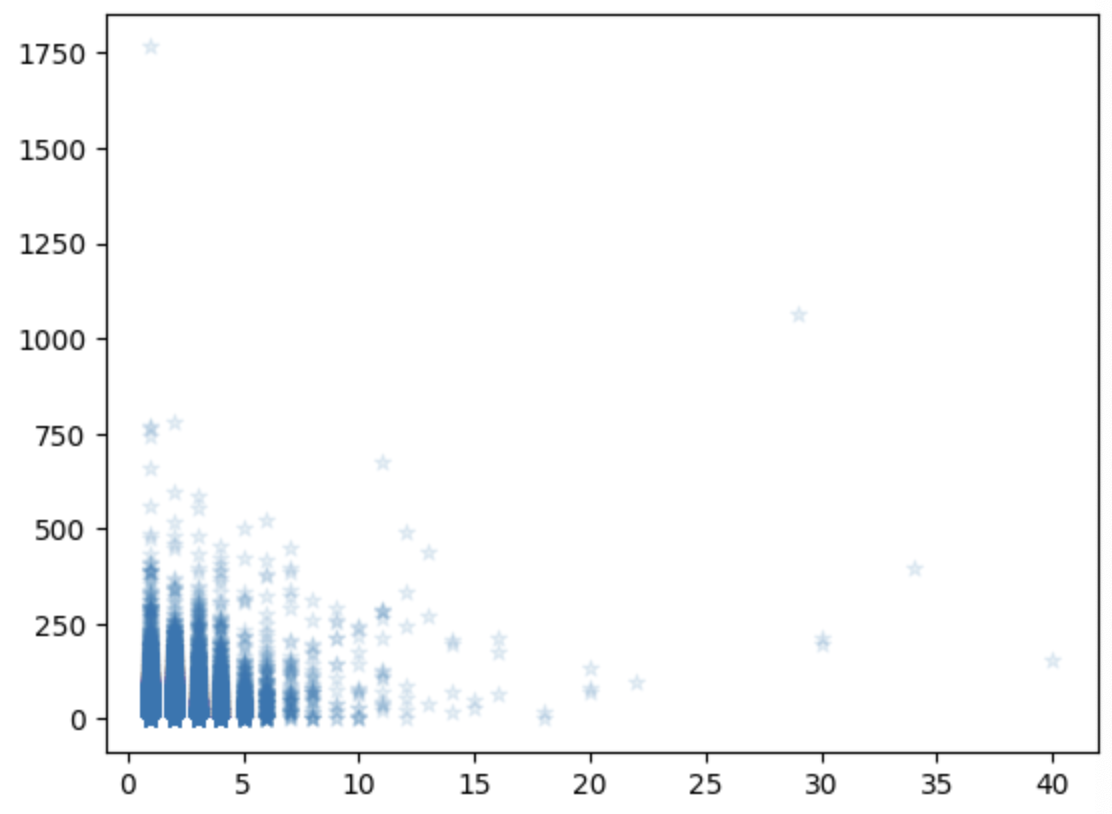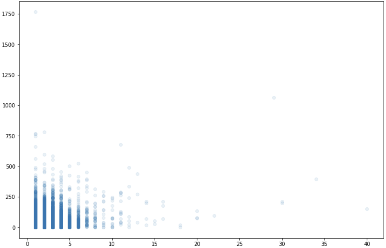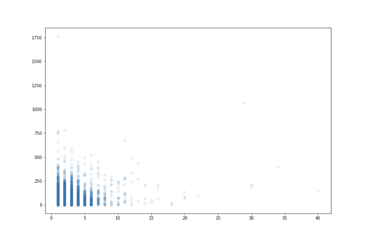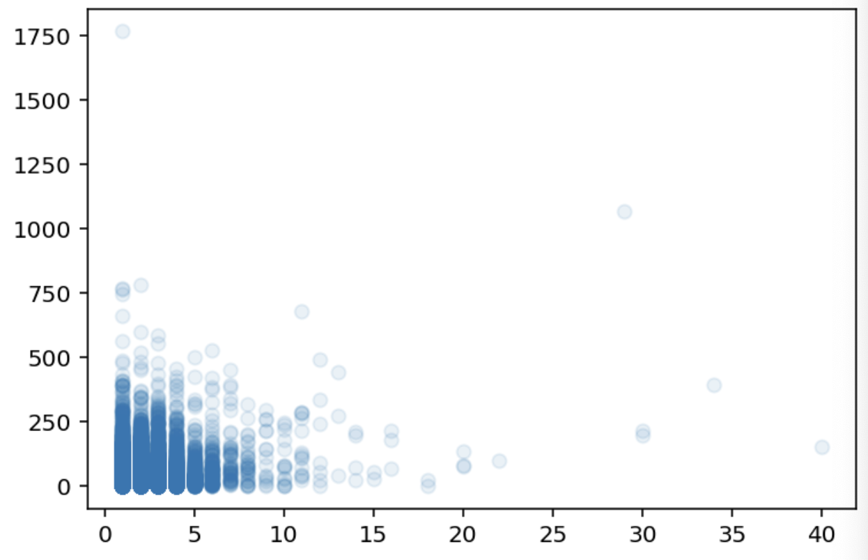 맷플롯립을 임포트한 후 투명도를 0.1로 지정하고 scatter() 함수로 '도서권수' 열을 x축, '대출건수'열을 y축으로 그리기