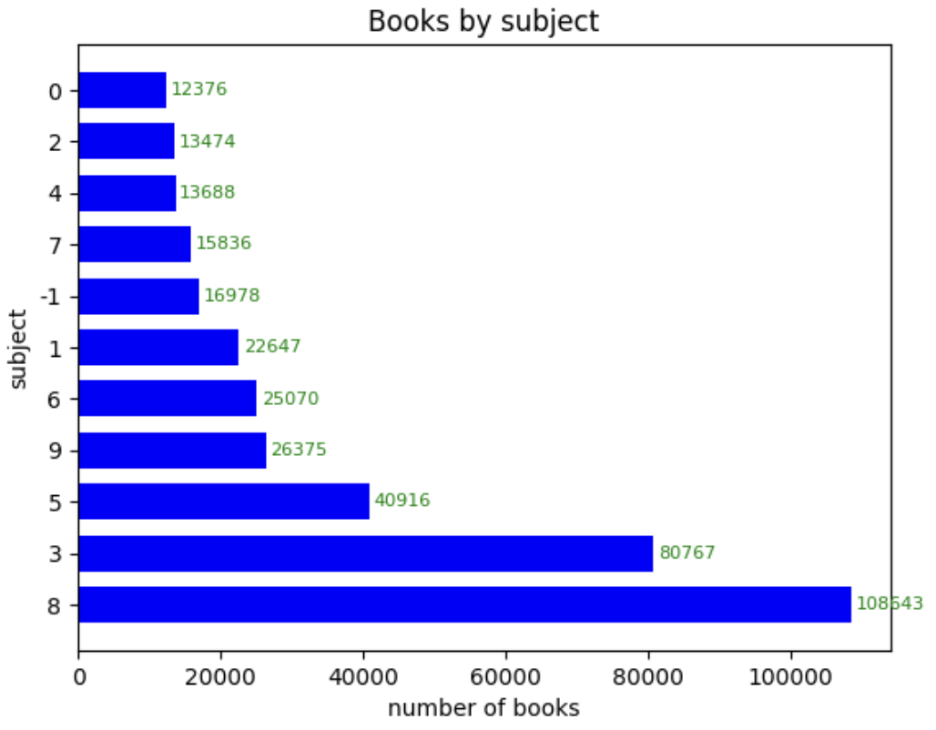 plt.barh(count_by_subject.index, count_by_subject.values, height=0.7, color='blue')