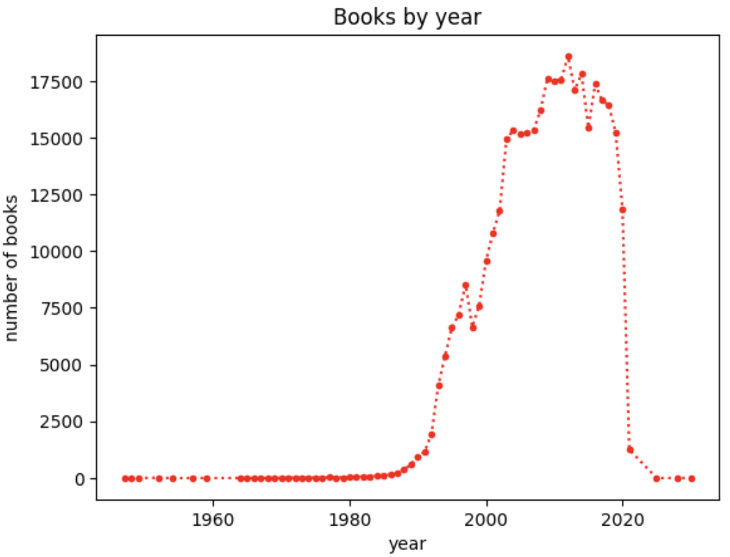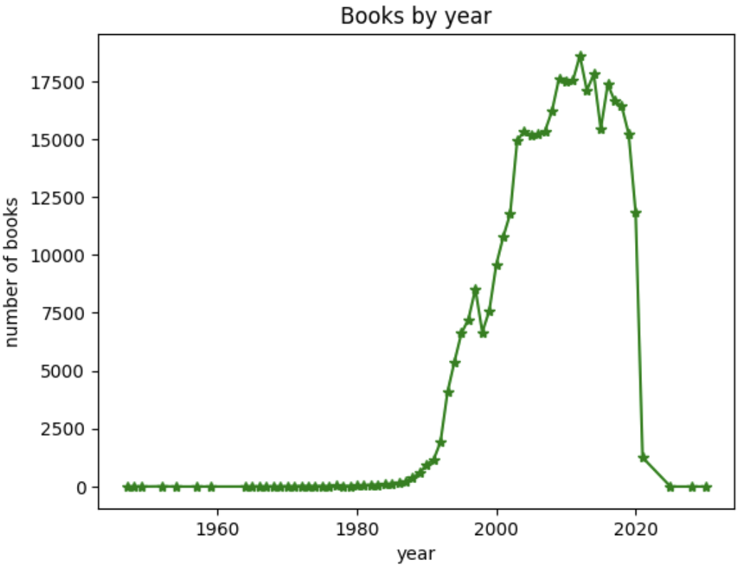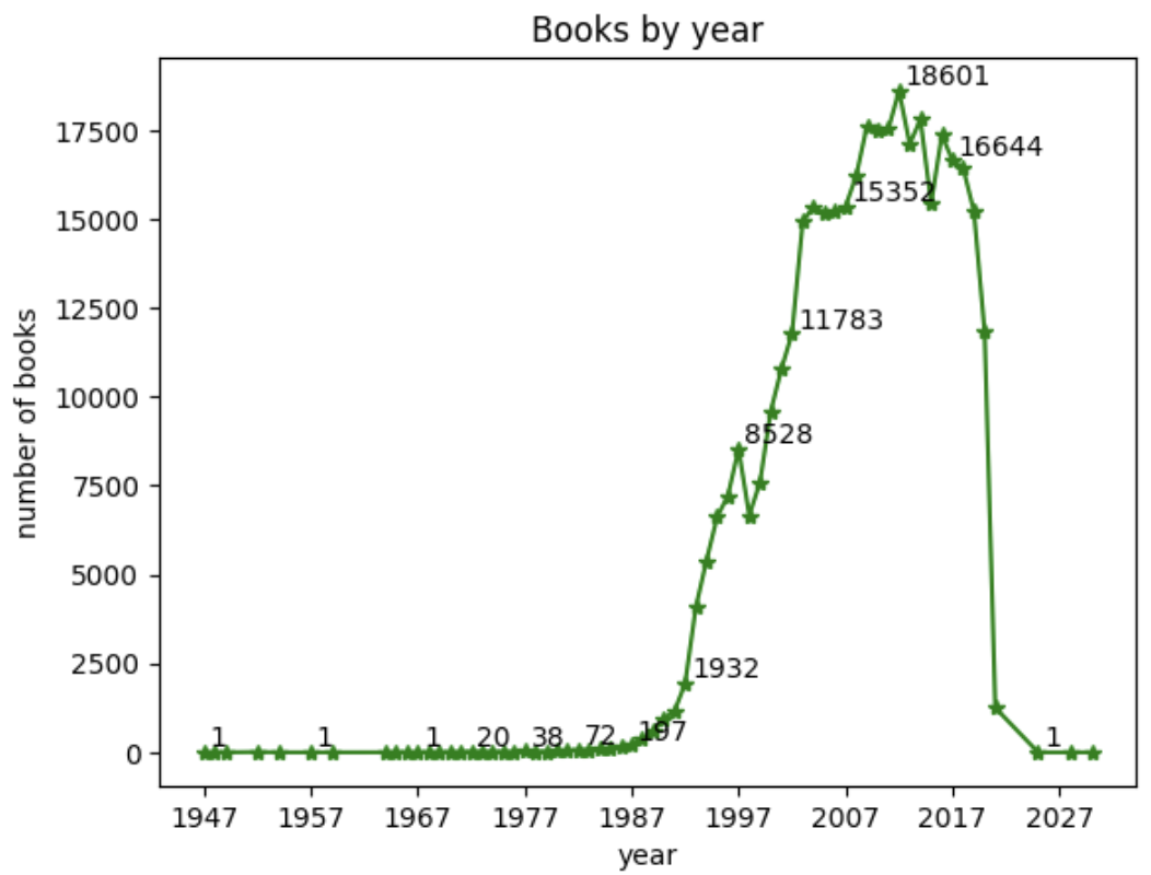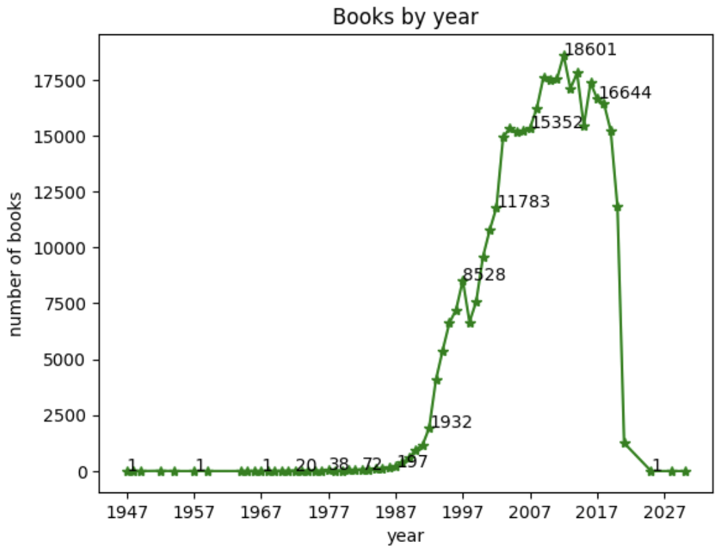 → 슬라이스 연산자(:)를 사용해 5개씩 건너뛰면서 count_by_year의 값을 선택