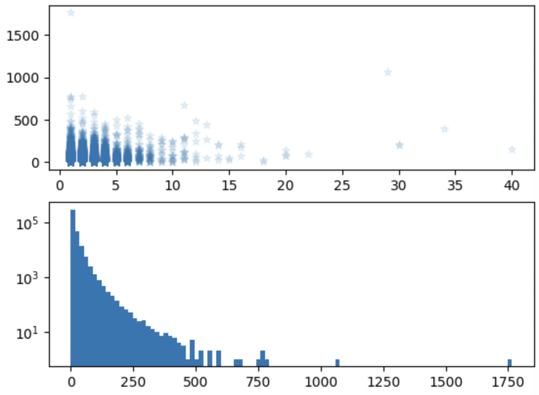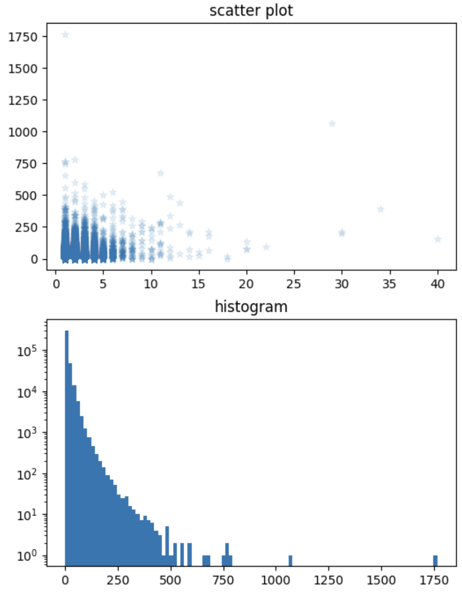 *두 번째 그래프는 히스토그램으로 x축은 '대출건수'열이고 y축은 대출건수의 빈도에 해당한다.