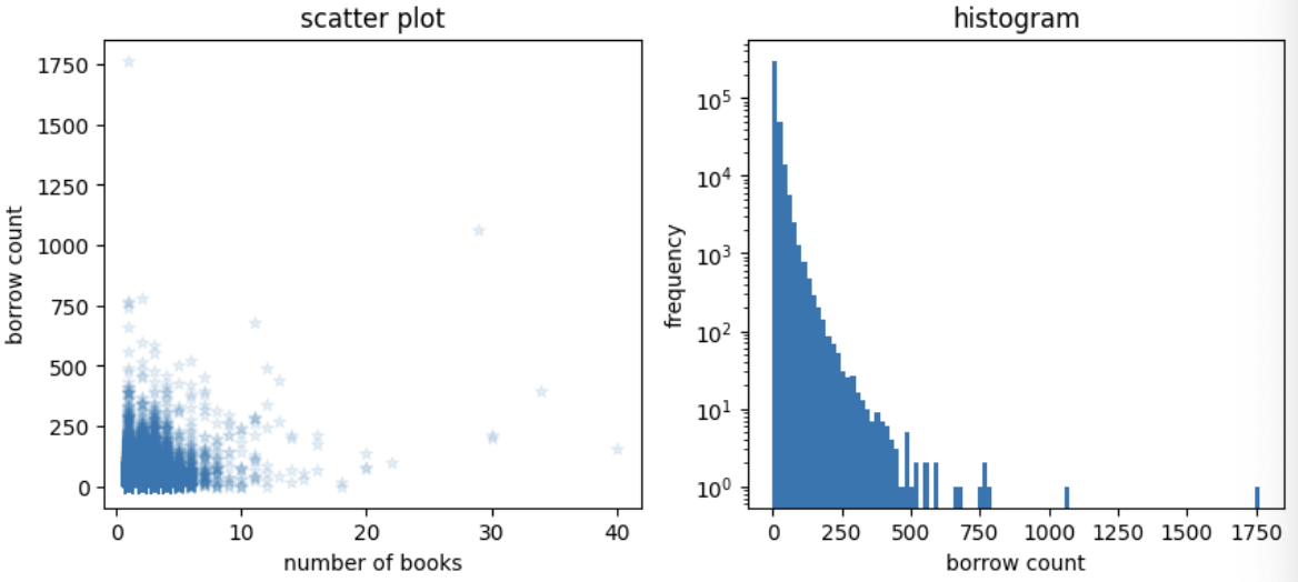 *첫 번째 그래프인 산점도의 x축은 '도서권수'열이고 y축은 '대출건수'열이다.