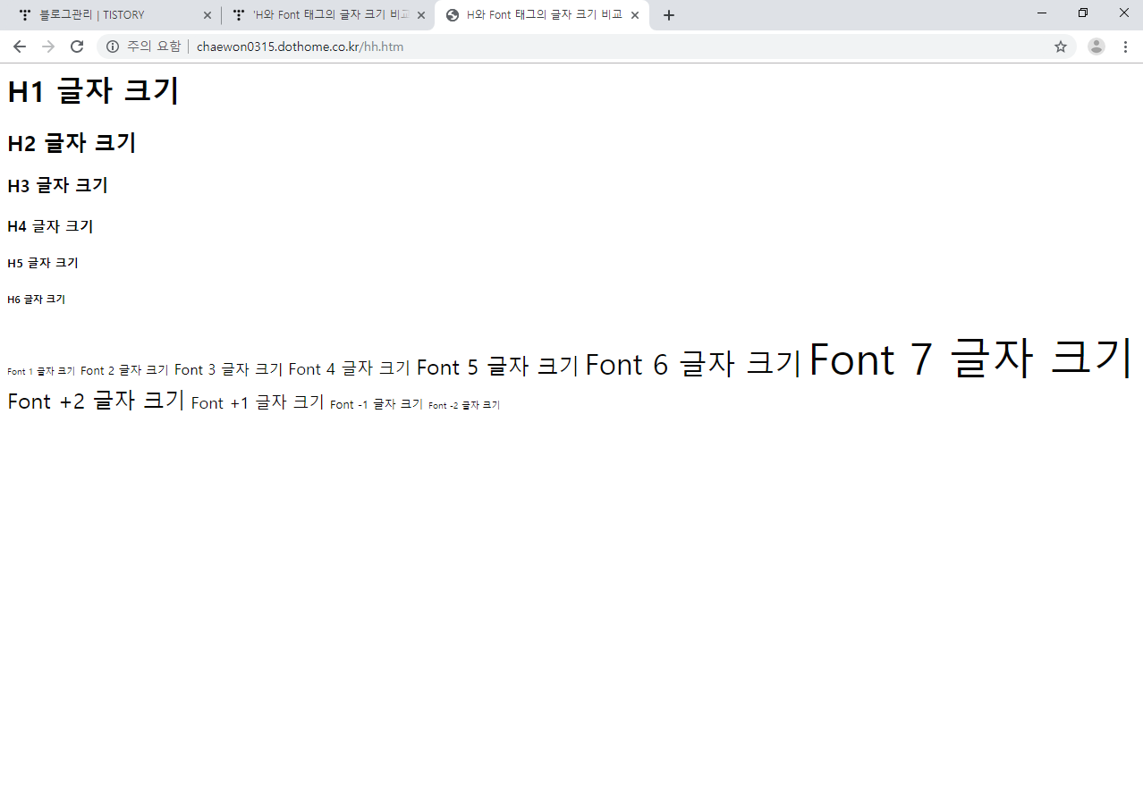 <TITLE> H와 Font 태그의 글자 크기 비교 </TITLE>